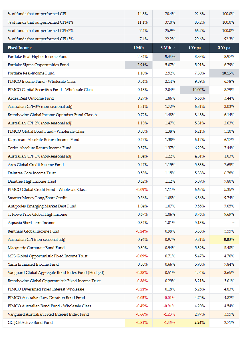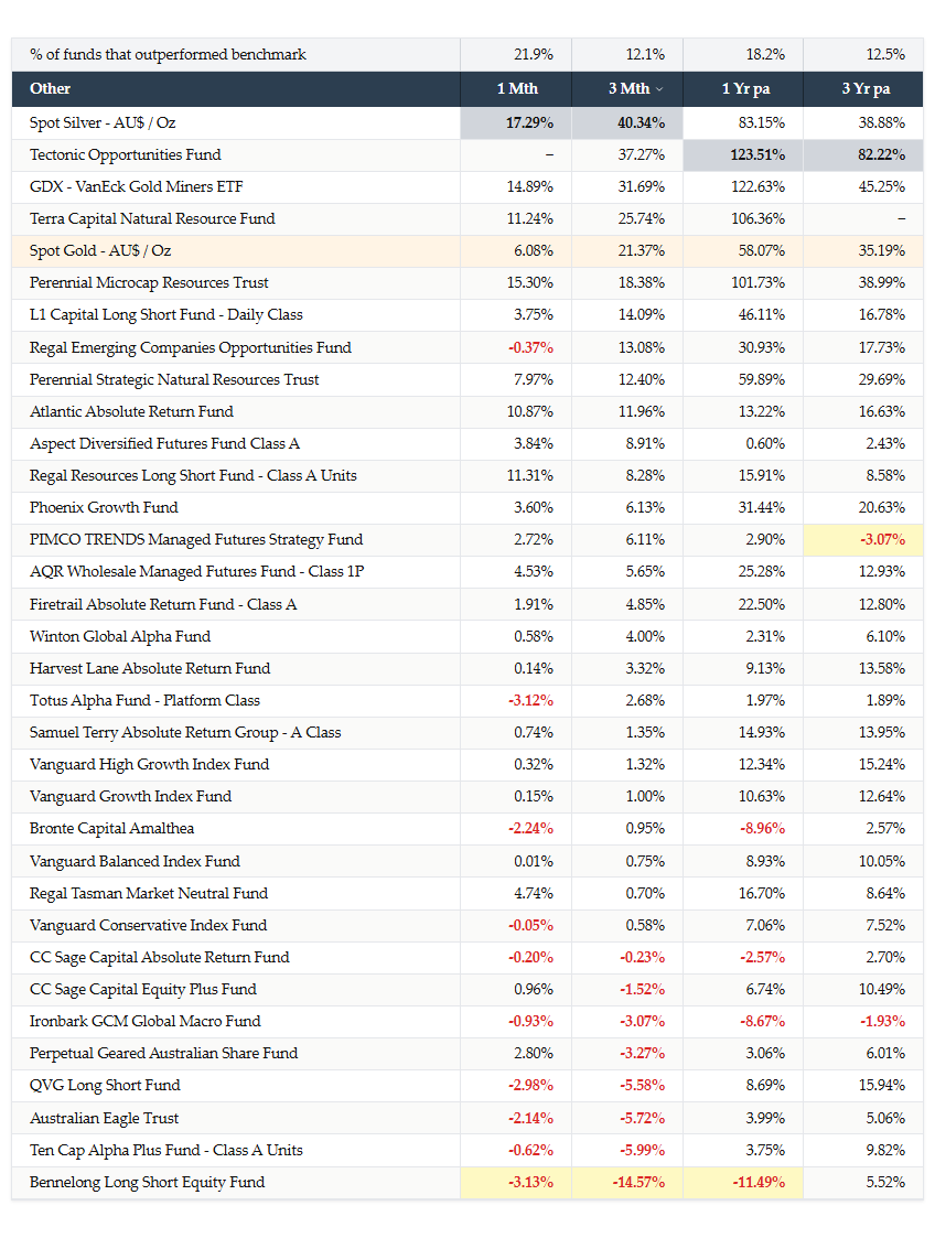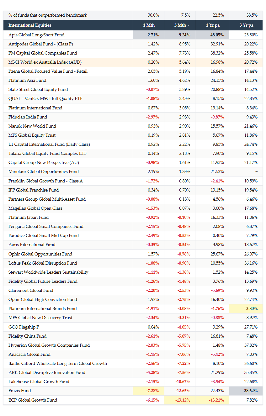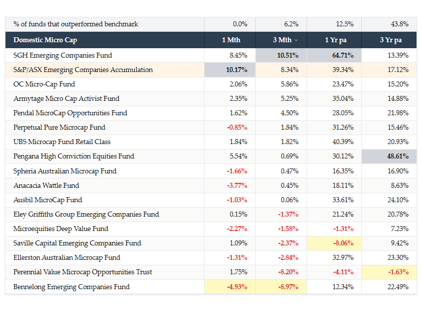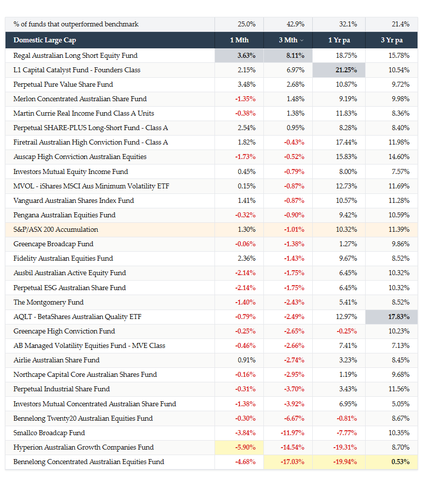Utterly filthy quarter where less than half the funds outperformed the ASX200. The larger the miss, the more concentration in the fund, all part of the active management game.