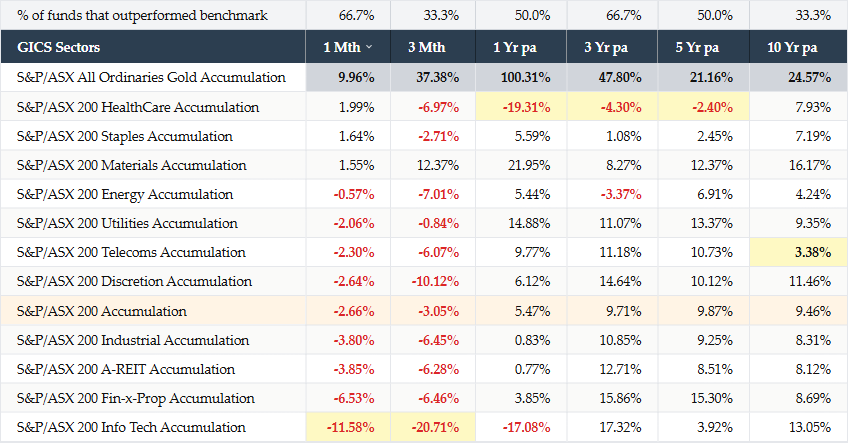 The healthcare debacle, now the worst performing index over 1, 3 and 5 years.