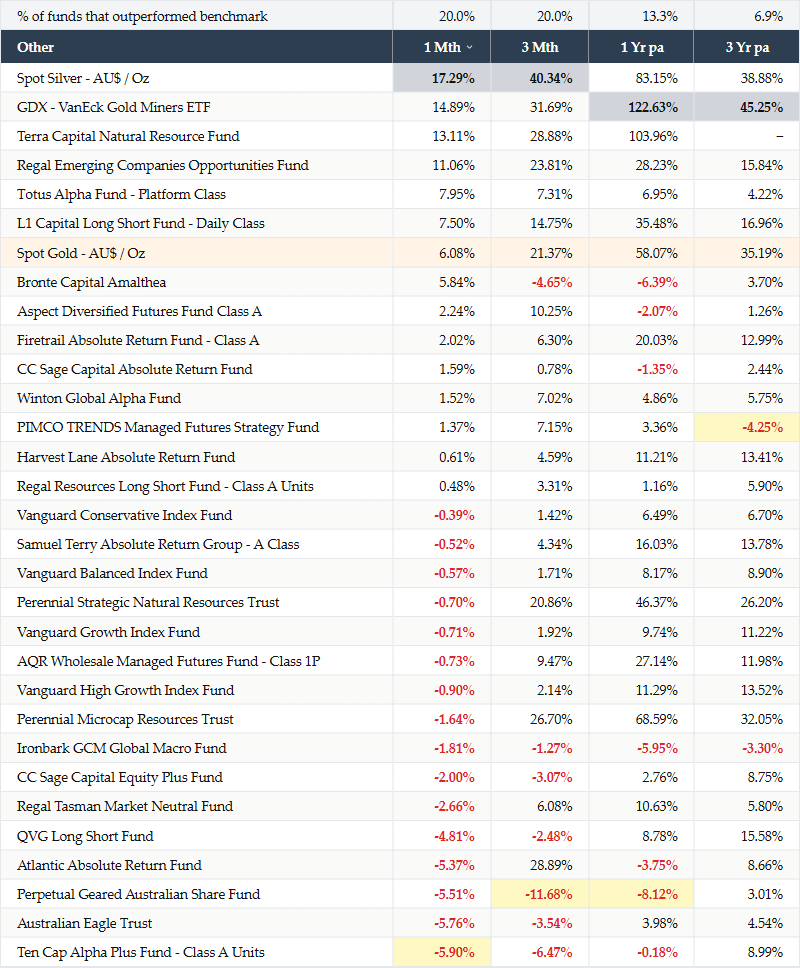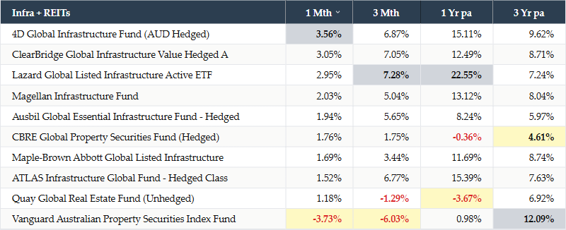 All tables are sorted by 1-month performance, with benchmark rows highlighted where relevant.