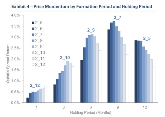 There are various different types of windows and measures of momentum factor. Say if you take away the 12 month return of a security from its 2 month return and then map that on a gradient and you can get a structure for how long alpha may persist from there. Awesome study by HIMCO showing that momentum factor returns last around 14-15 months. The signal period (12 mth vs 7mth) doesn’t change duration of the factor. Why? God who knows!
