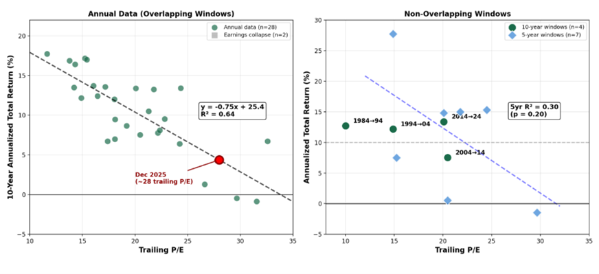 And what if we swap out CAPE for trailing PE ratios for the S&P500? However in this one I show you what non-overlapping, independent observations look like: